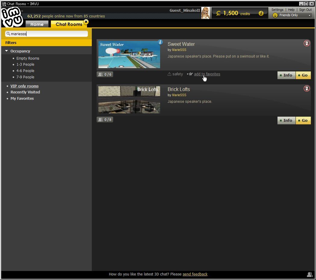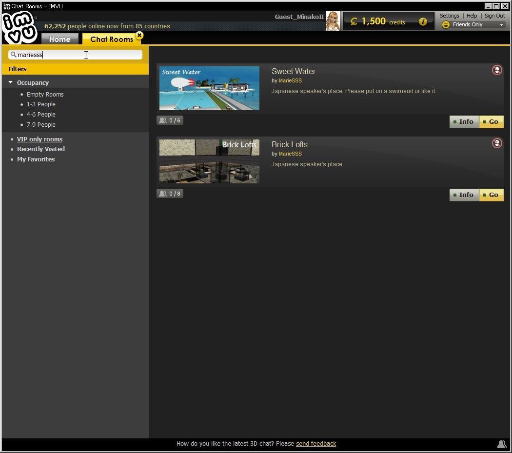 「検索ボックス」では、「japan」などの単語の他に、「アバター名」でも検索できます。ちなみに、わたしがメインで使っているアバター「MarieSSS」の場合だと、下の画像のように表示されるはずです。もちろん、そのアバターのアカウントでパブリックルームをOPENさせていることが条件なので、全てのアカウントのパブリックルームが自動的に準備されているわけではありません。(パブリックルームを持つには、アクセスパスを購入するかVIP会員にならないといけません。詳しくは後述・・・の予定)