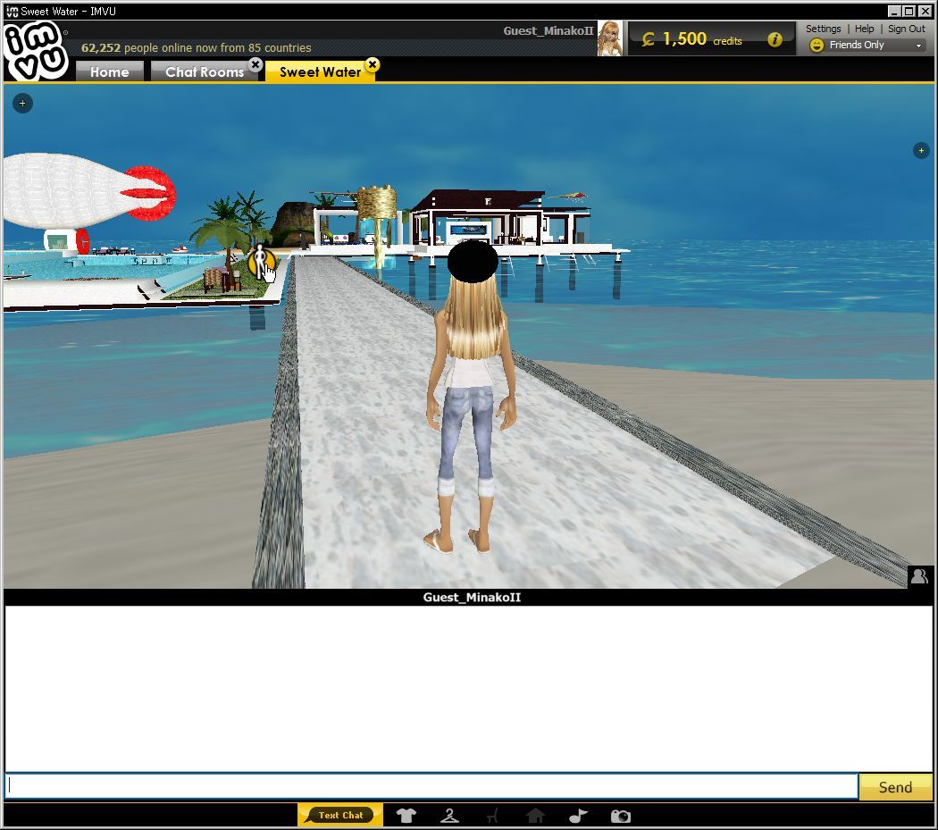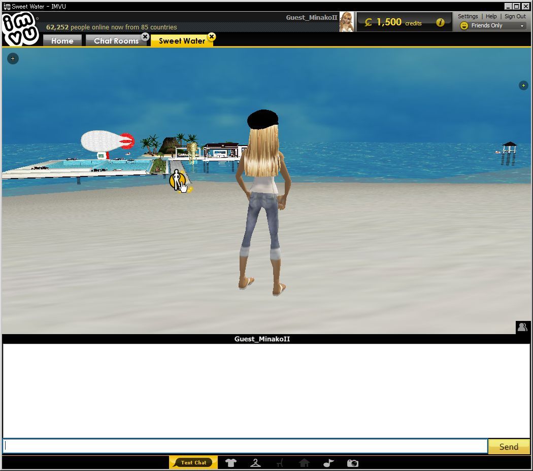 基本的にIMVUはゲームではなくチャットですから、歩いたり飛んだりといった動作で移動はできません。ポイント(黄色いマーカーみたいなもので、マウスの近辺に自動で表示されます)