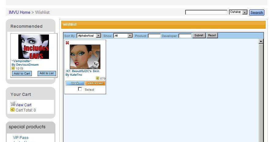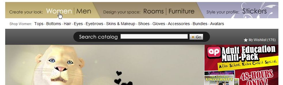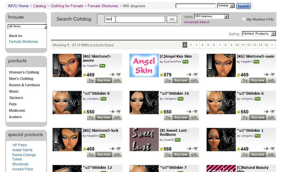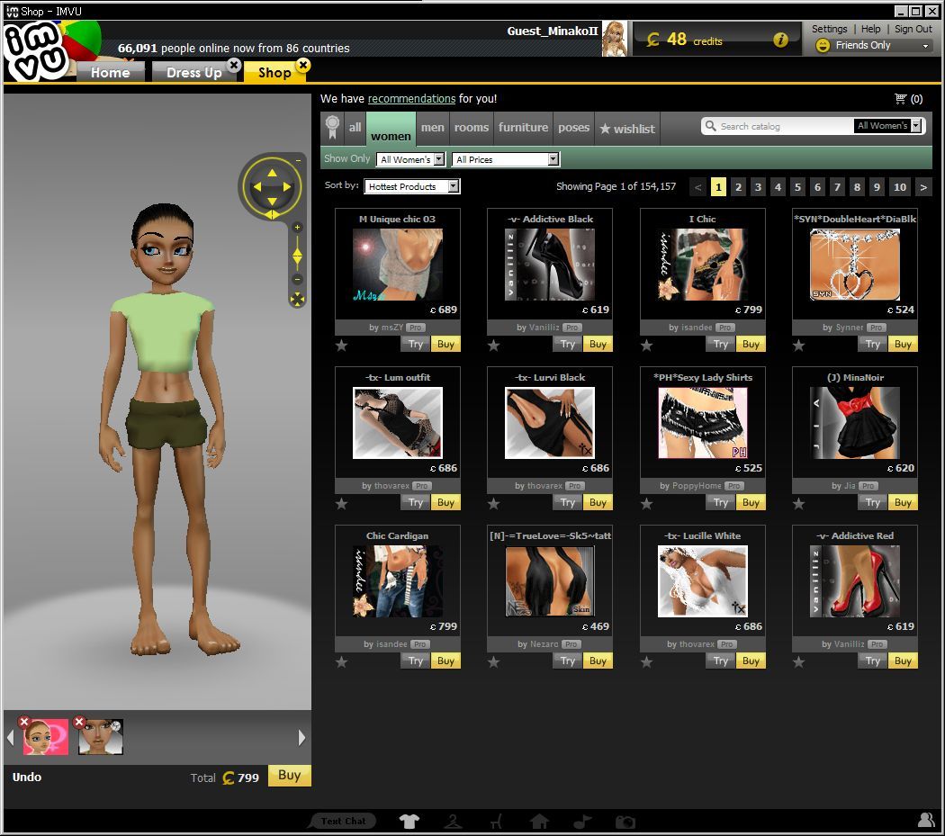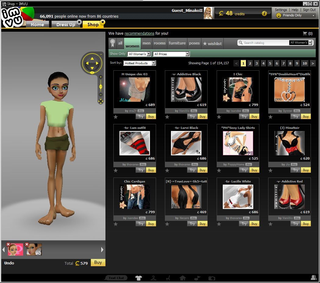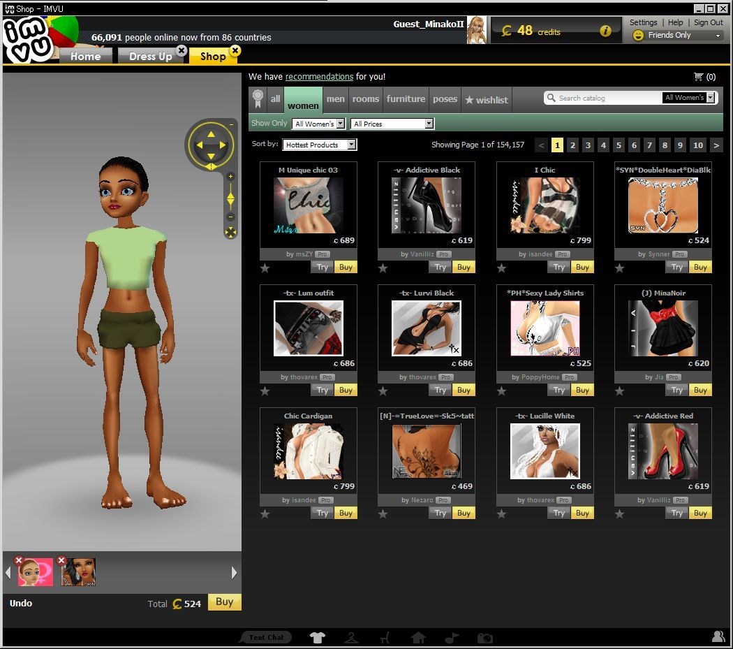 「Try」ボタンを押すと、IMVUのメイン画面のほうに「Shop」タブが現れて、下に様な表示になるのです。