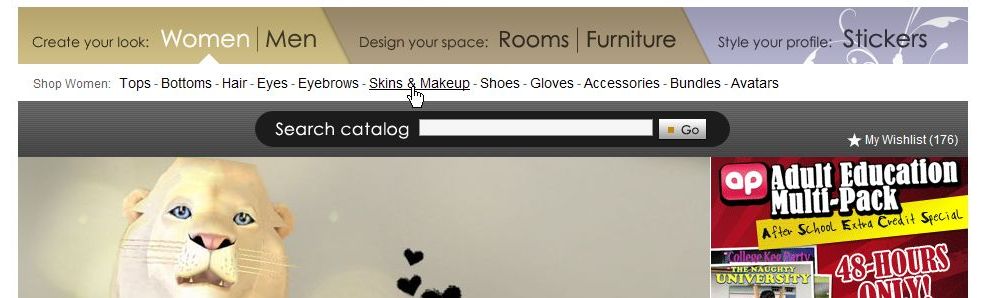 上の画像にあるように、まず「Woman」を選択。そのあとに、下の画像にあるように「Skins & Makeup」を選びます。