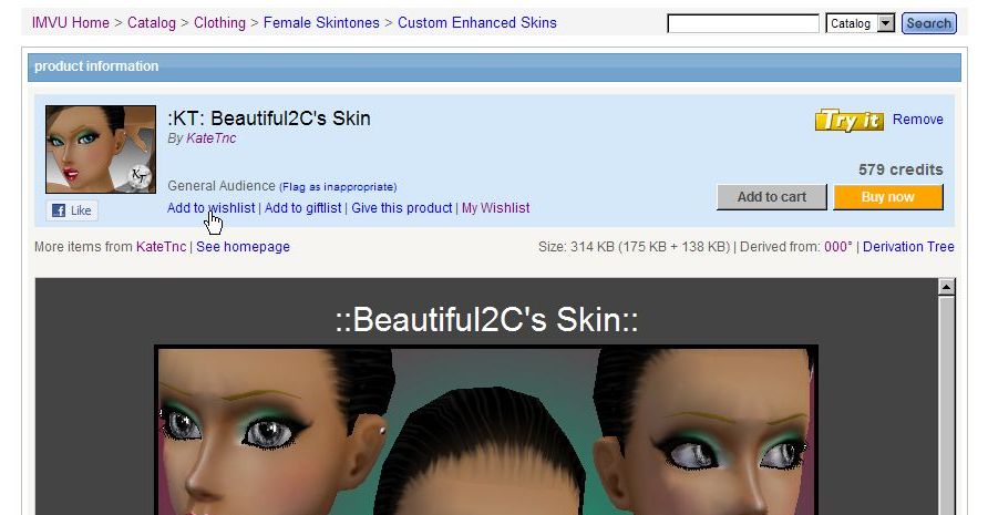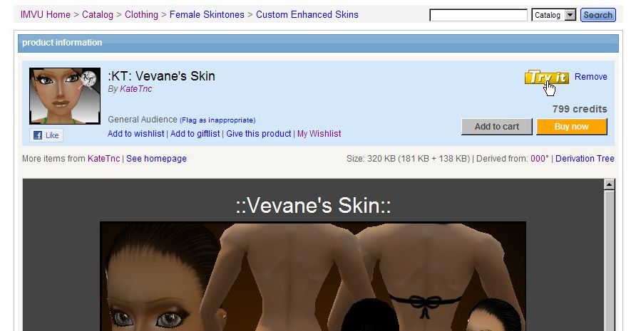 試着をするには、カタログリストのサムネイル下したにある「Try」ボタンを押してもいいですけど、もっと詳しい内容が知りたい場合は、そのサムネイルをクリックして商品のページに移ることもできます。商品のページにも「Try it」という「Try」ボタンがあるのでそちらでも同じことが出来ます。