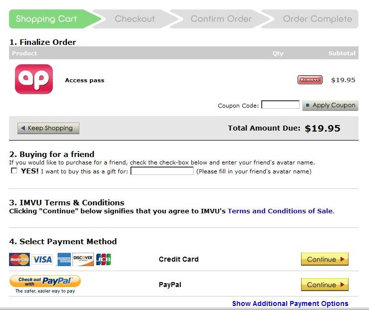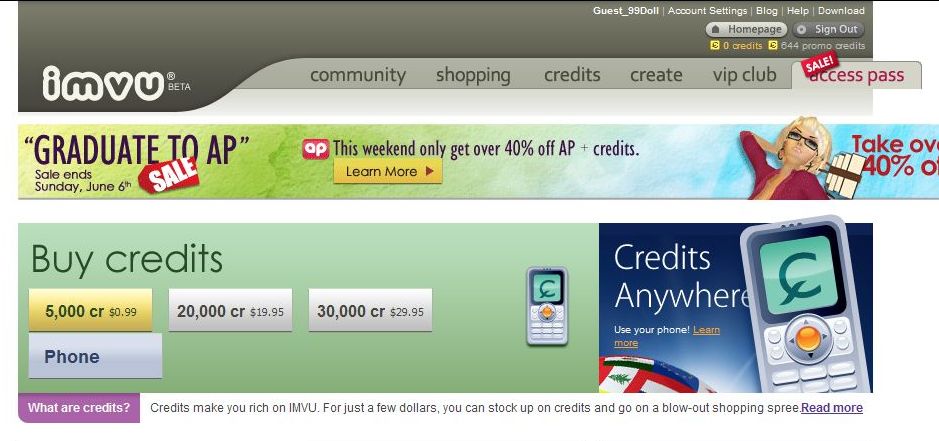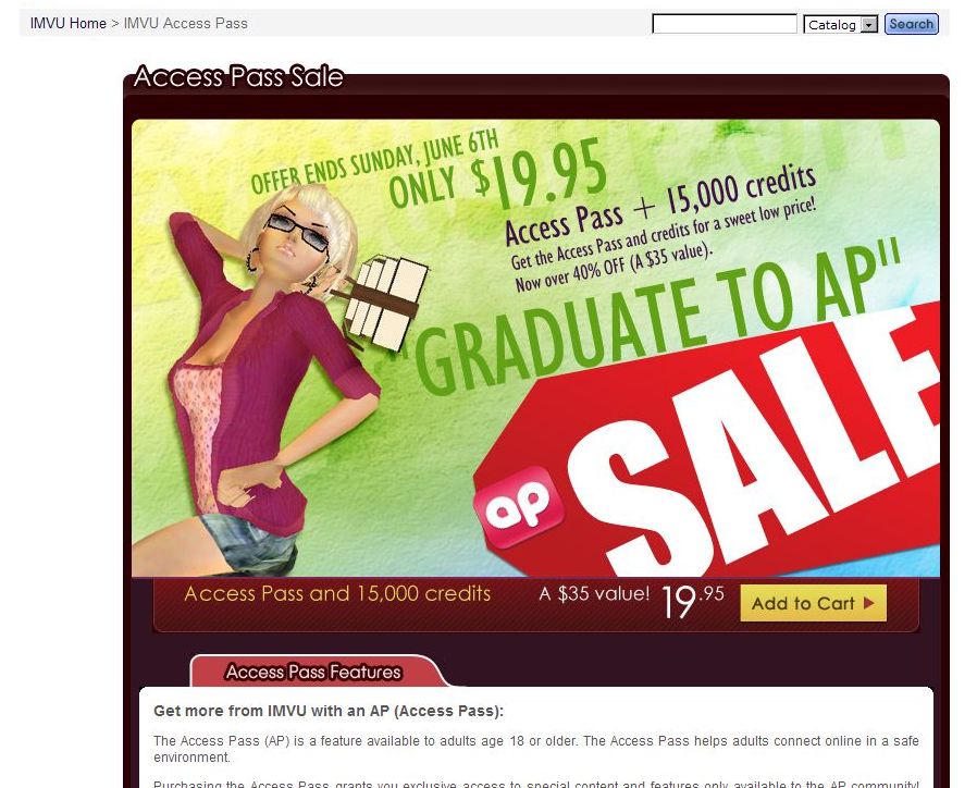 アクセスパス(Access pass)とは、アダルトなコンテンツの利用が可能になる権利です。IMVU自体は無料で楽しめますけど、これは有料となっていて通常は19.95$ですね。時折キャンペーンをやってて安くなったりしたこともありましたけど、前回などは他にアダルトな衣装とかクレジットが抱き込みになって、かえって高くなってた時もあったみたいです。