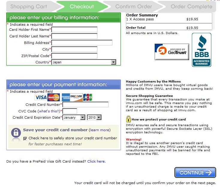 個人情報、カードの情報塔をいれてから、青い「Continue」ボタンで先に進みます。
